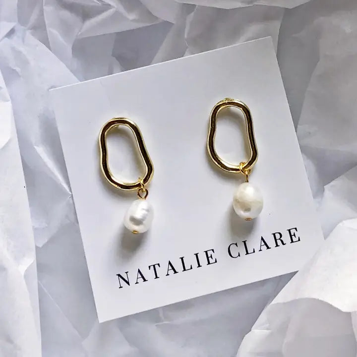 Light gold oval earring stud with a natural freshwater pearl.