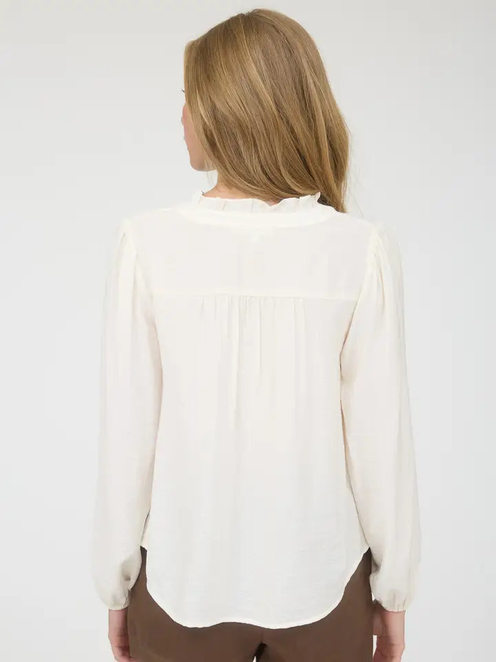 The Kale Cream Blouse is a playful twist on classic style with its flirty V neckline and cozy long sleeves finished with elastic cuffs for a comfortable fit. The textured woven fabric adds subtle charm, while elegant yoke detailing brings a touch of personality. Crafted from a soft blend of rayon and nylon, this lightweight top is perfect for layering or wearing on its own anytime you want to feel effortlessly chic.