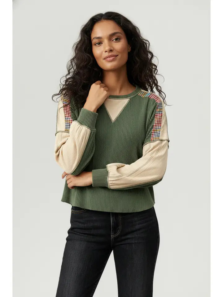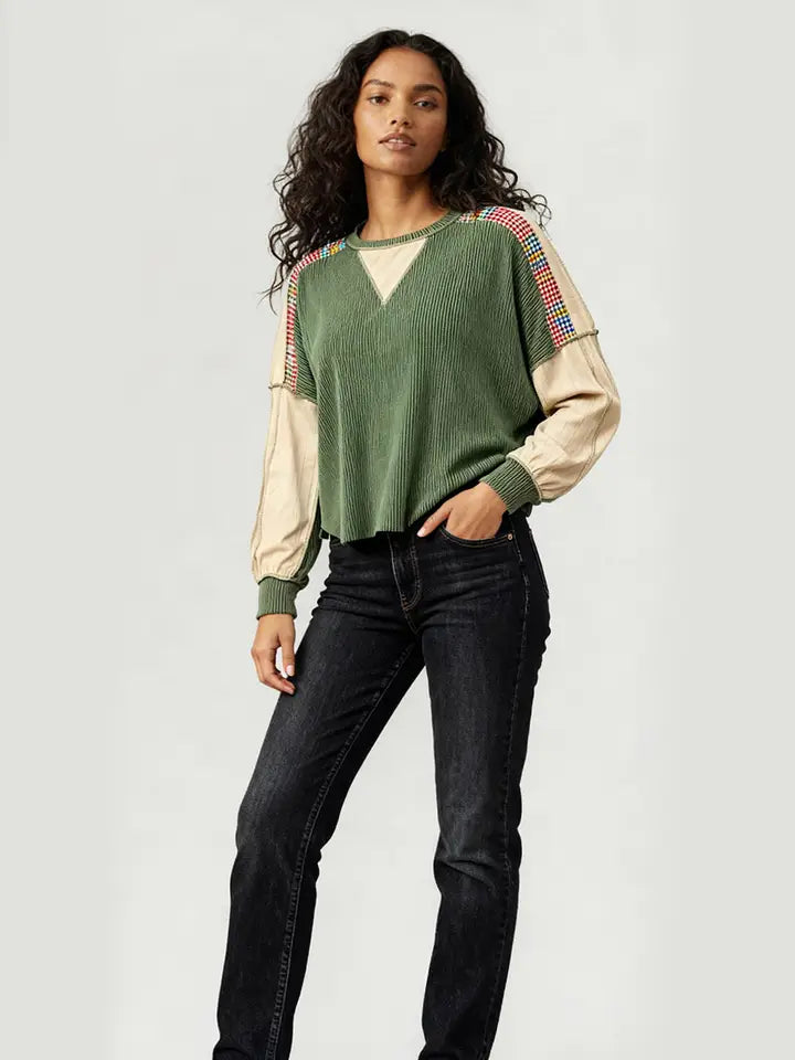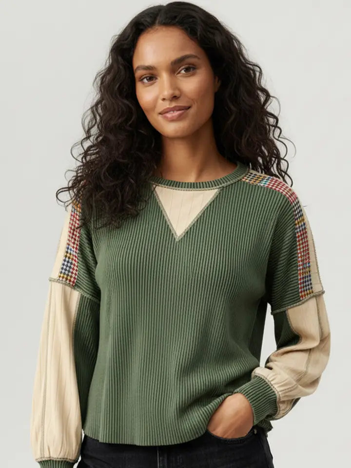 Elevate your everyday style with this modern long sleeve top featuring a striking color block design. The round neckline and drop shoulder silhouette create an effortlessly relaxed fit, while the wavy rib knit fabric adds subtle texture and movement. Triangle details at the neckline bring visual interest, and quality reverse stitching with overlock seams ensure durability. Perfect for layering or wearing solo, this versatile piece transitions seamlessly from casual days to cozy evenings.