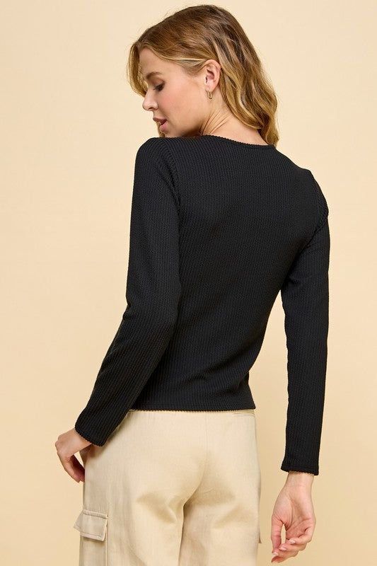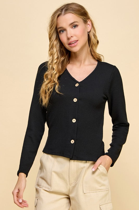 Elevate your everyday wardrobe with our Felicity Black Top, a timeless long sleeve v-neck design crafted from soft ribbed fabric. The button-front closure adds a polished touch, making it perfect for layering or wearing solo. This versatile piece transitions seamlessly from casual days to dressed-up occasions, offering comfort and style in one flattering silhouette. A boutique essential that works with everything in your closet.