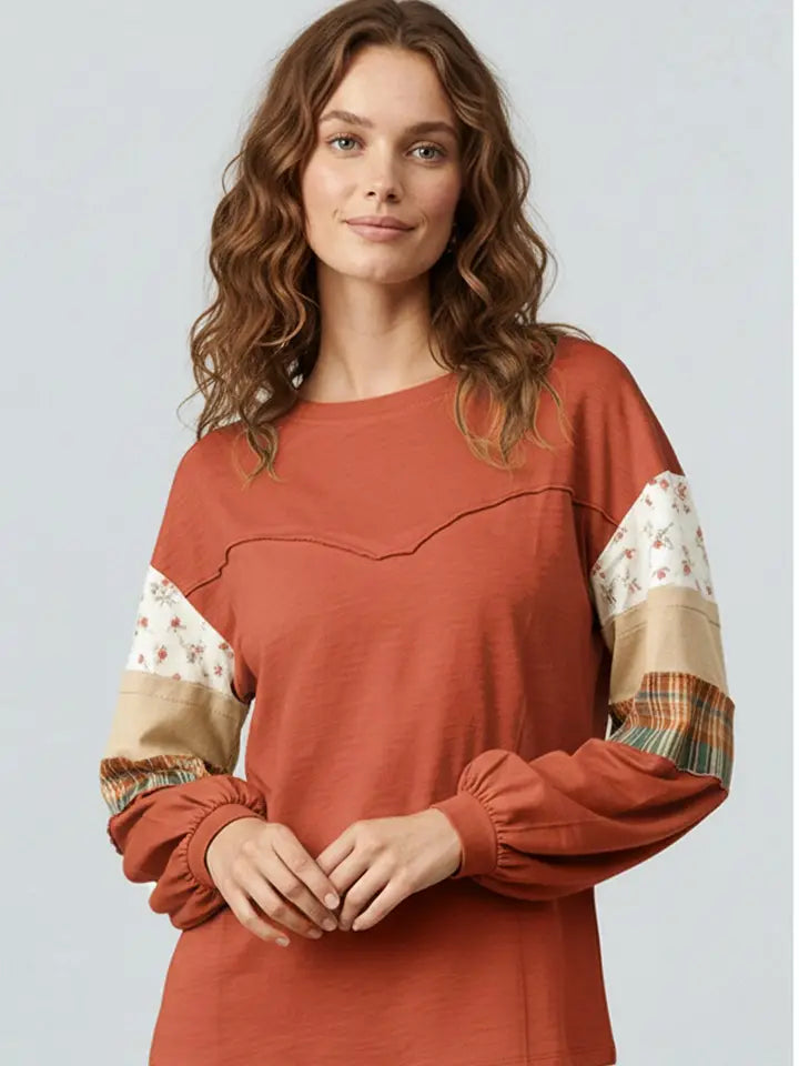 The Kate Terracotta Top combines effortless style with comfortable everyday wear. This oversized long sleeve knit features a relaxed drop shoulder silhouette, perfect for layering or wearing solo. The round neckline and cut edge detailing add modern appeal, while the color block design with floral and plaid elements brings visual interest. Crafted from soft cotton, it's an easy-to-style piece that works beautifully with your favorite jeans or casual bottoms.