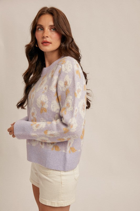 Say hello to effortless spring style with this whimsical lilac pullover! Adorned with charming floral motifs, this crew neck sweater brings a touch of botanical bliss to your closet. The relaxed fit drapes beautifully for all-day comfort, whether you're running errands or settling in for a cozy night.