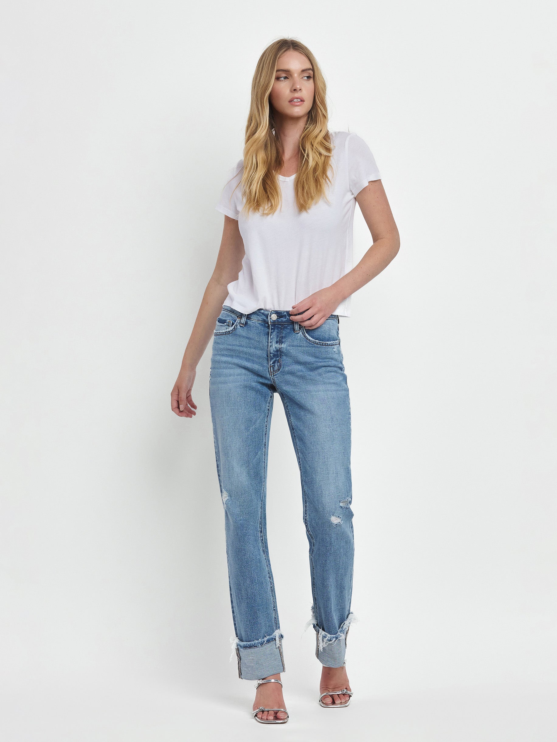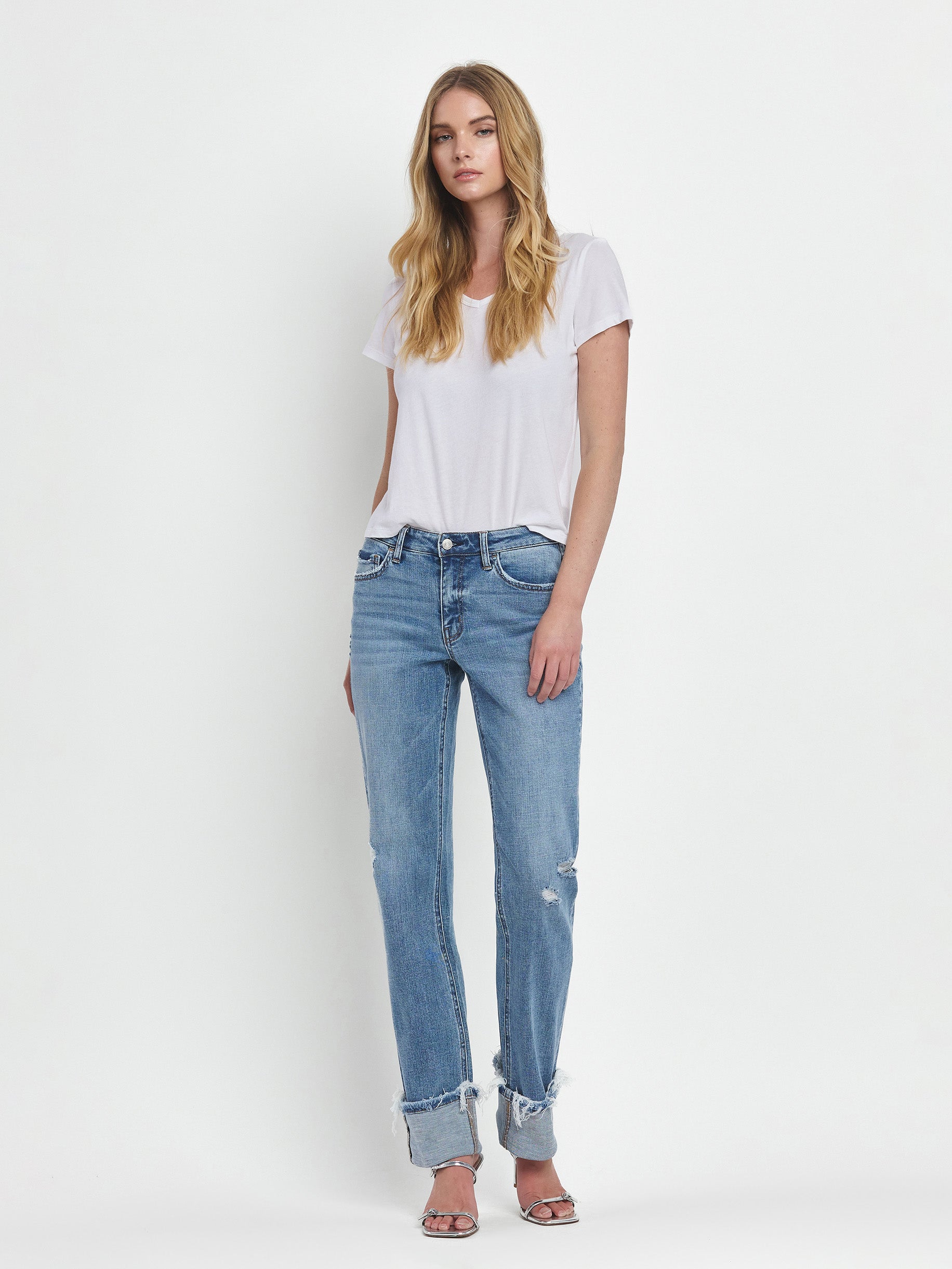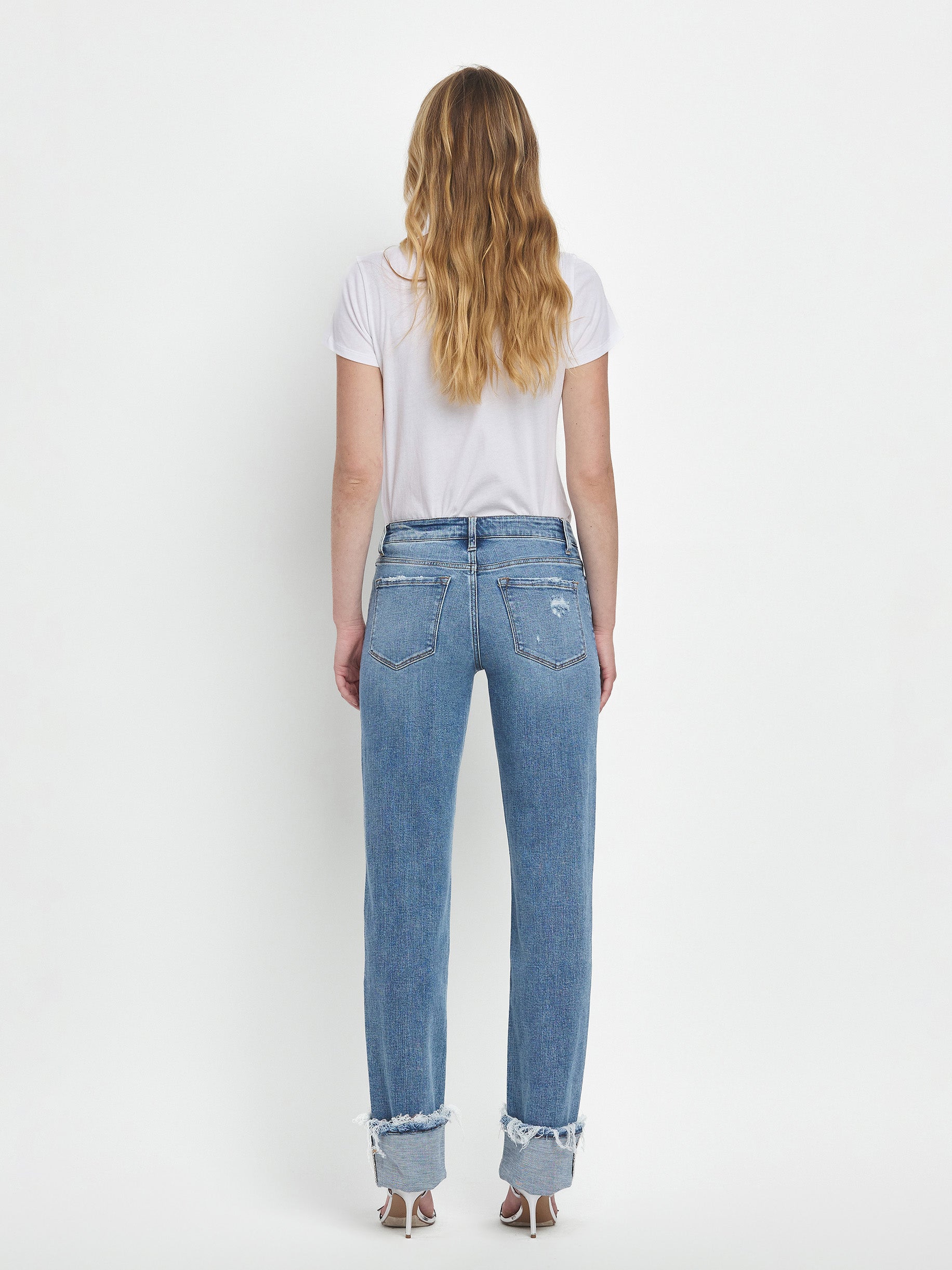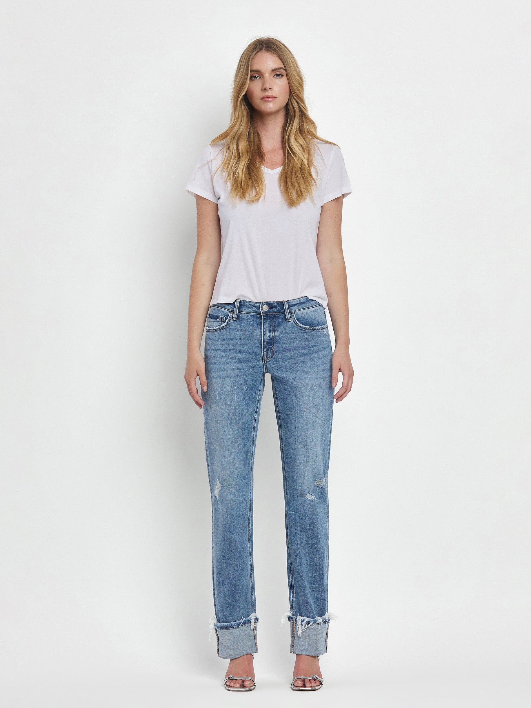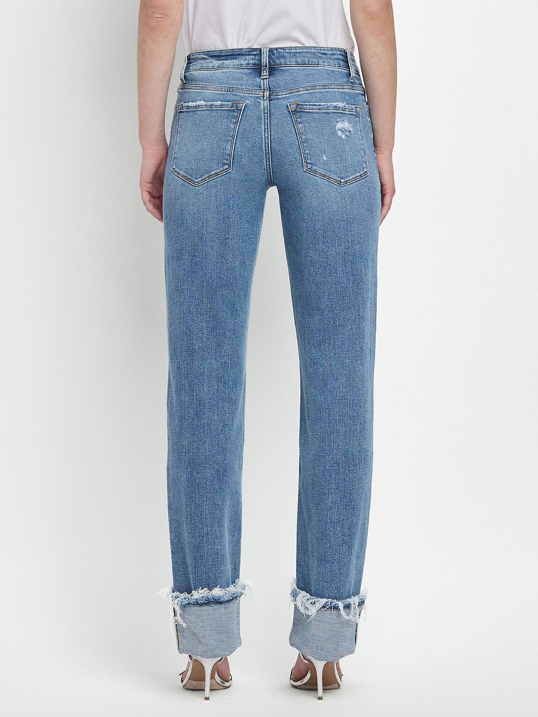 Evermore Mid Straight 32" jeans combine comfort and style with a mid-rise waist and straight leg silhouette. Crafted from stretch denim, these jeans move with you throughout the day while maintaining their shape. Distressed detailing adds character, while the single cuff hem and full length create a polished finish. Perfect for everyday wear.