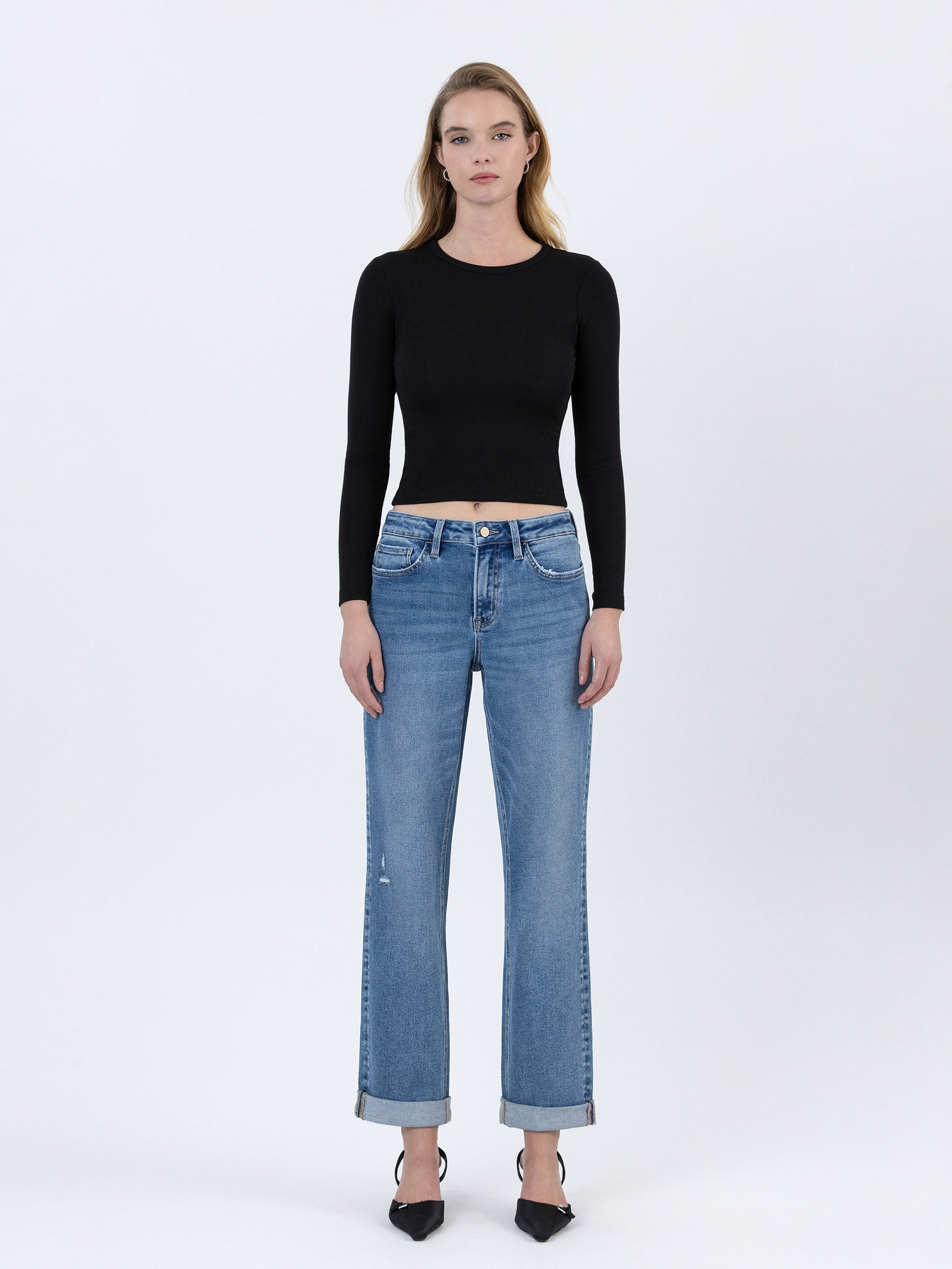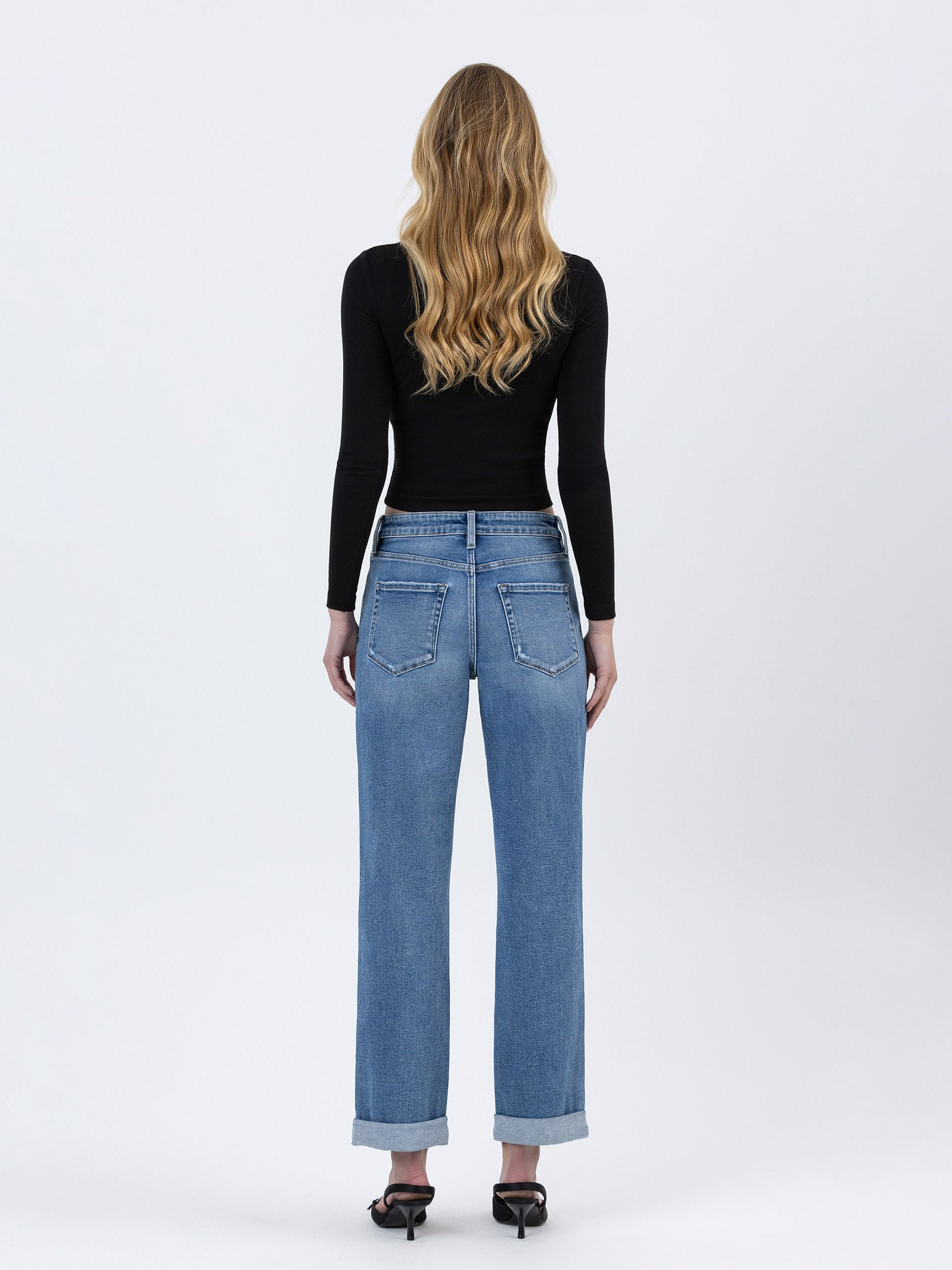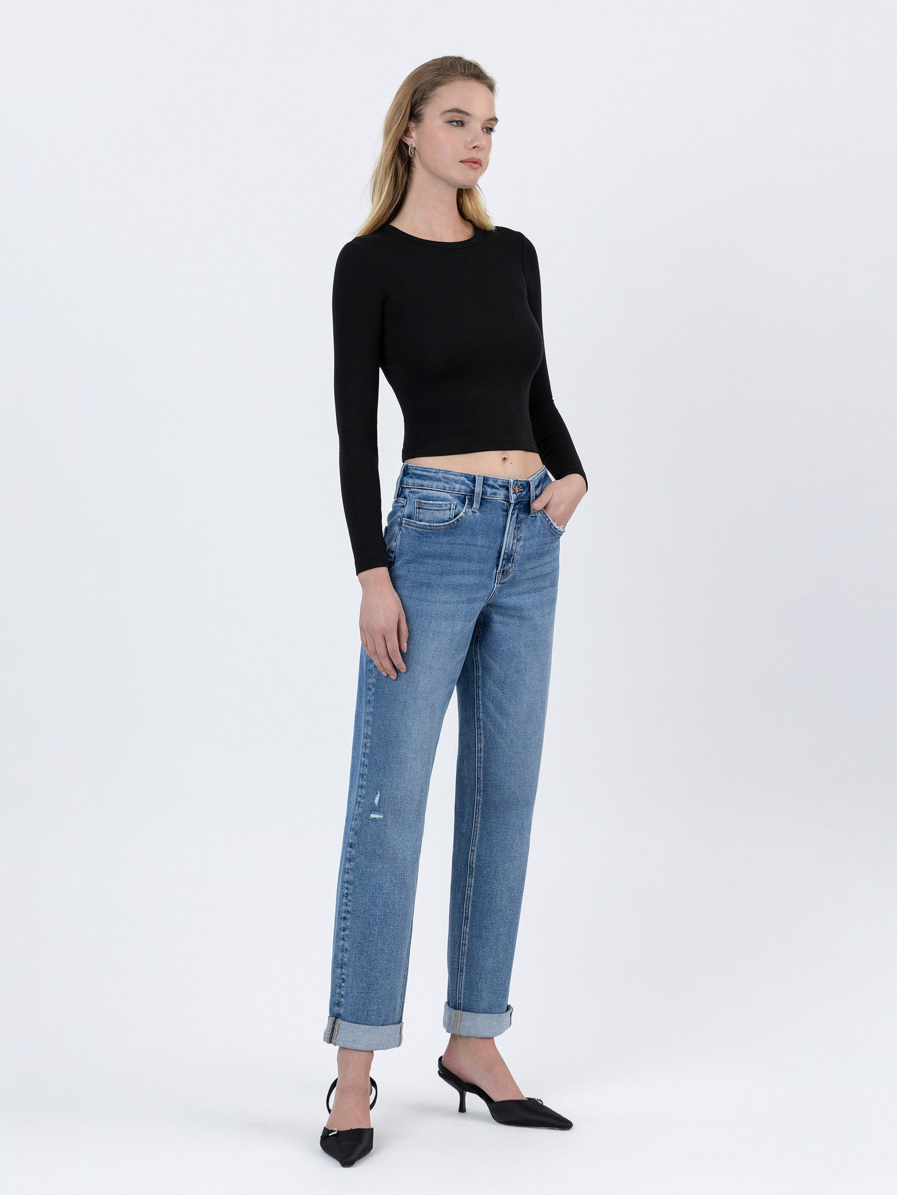 These Fecilitous High Boyfriend jeans feature a comfortable stretch denim with a flattering high-rise waist. Lightly distressed details add subtle character, while the double cuff hem and cropped length offer a modern, relaxed look. Perfect for effortless style with everyday comfort.