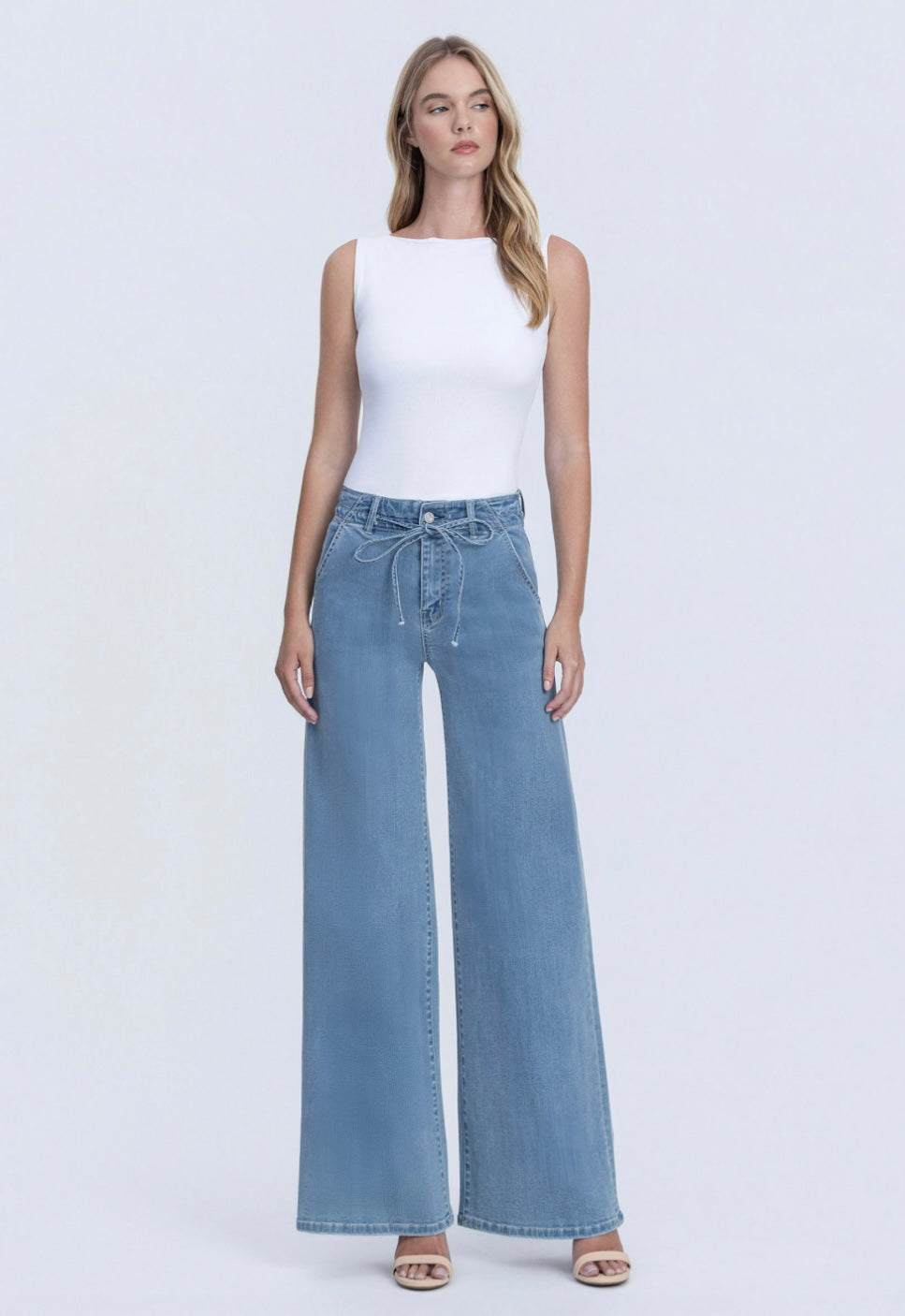 Elevate your denim game with the Promise Tie High Palazzo—where comfort meets effortless style. These full-length palazzo jeans feature a flattering high-rise waist with an adjustable tie detail for a custom fit that moves with you. Crafted from stretchy denim in a versatile medium wash, they deliver all-day comfort without sacrificing that polished look. The finished hem keeps things neat and chic. Perfect for anyone who refuses to choose between looking good and feeling amazing.