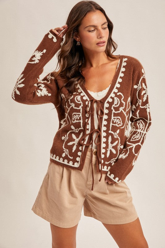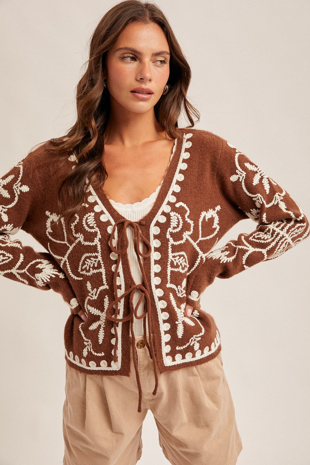 Layer up in style with the Chloe Embroidered Sweater—your new favorite piece for effortless chic. This v-neck sweater jacket features delicate embroidered details that add personality and charm to any outfit. Perfect for transitional weather, it pairs beautifully with everything from casual jeans to polished trousers. The relaxed fit keeps you comfortable while the thoughtful embroidery elevates your everyday look. Whether you're heading to brunch or the office, this versatile sweater jacket is ready to become your go-to layer.