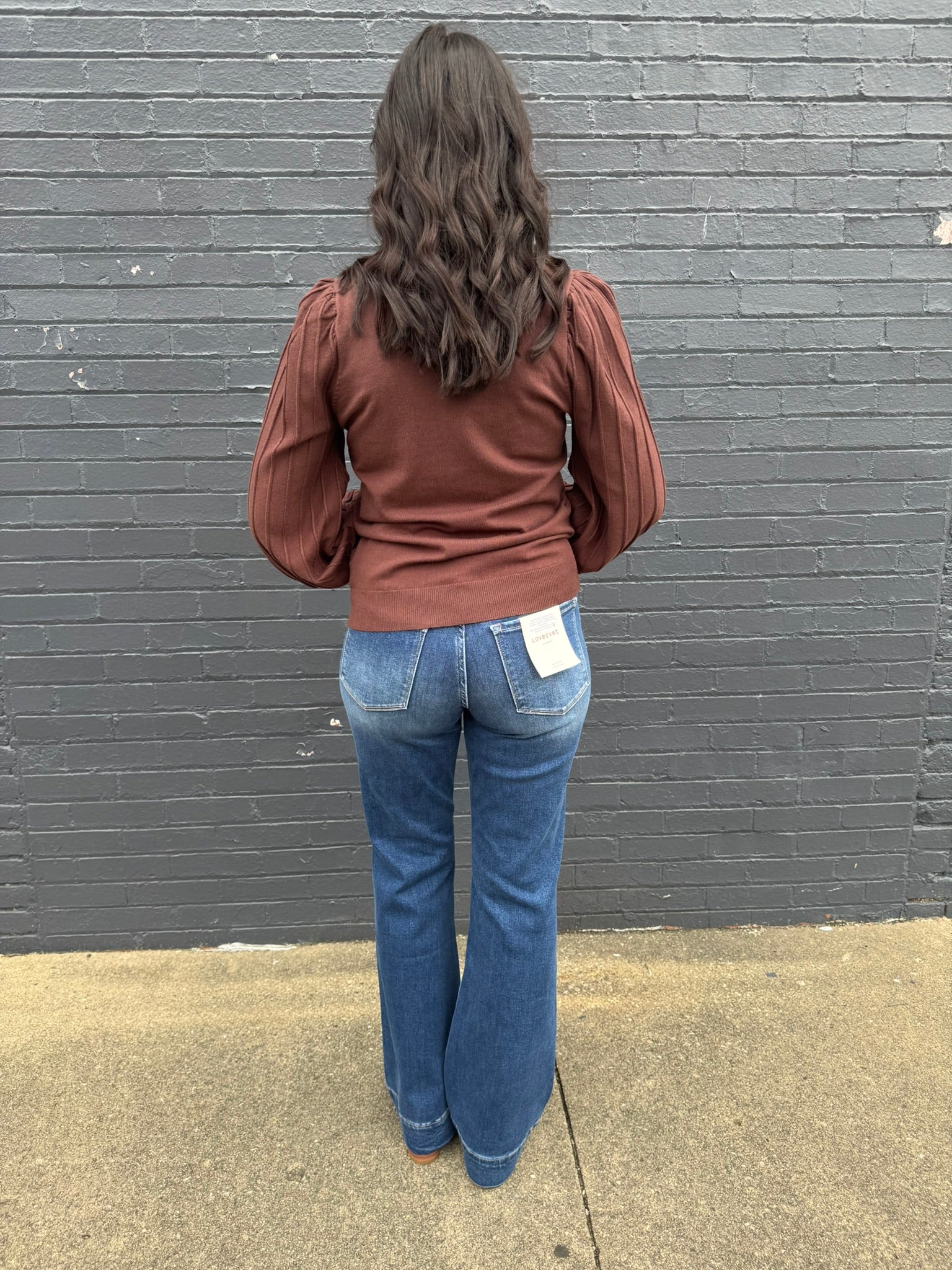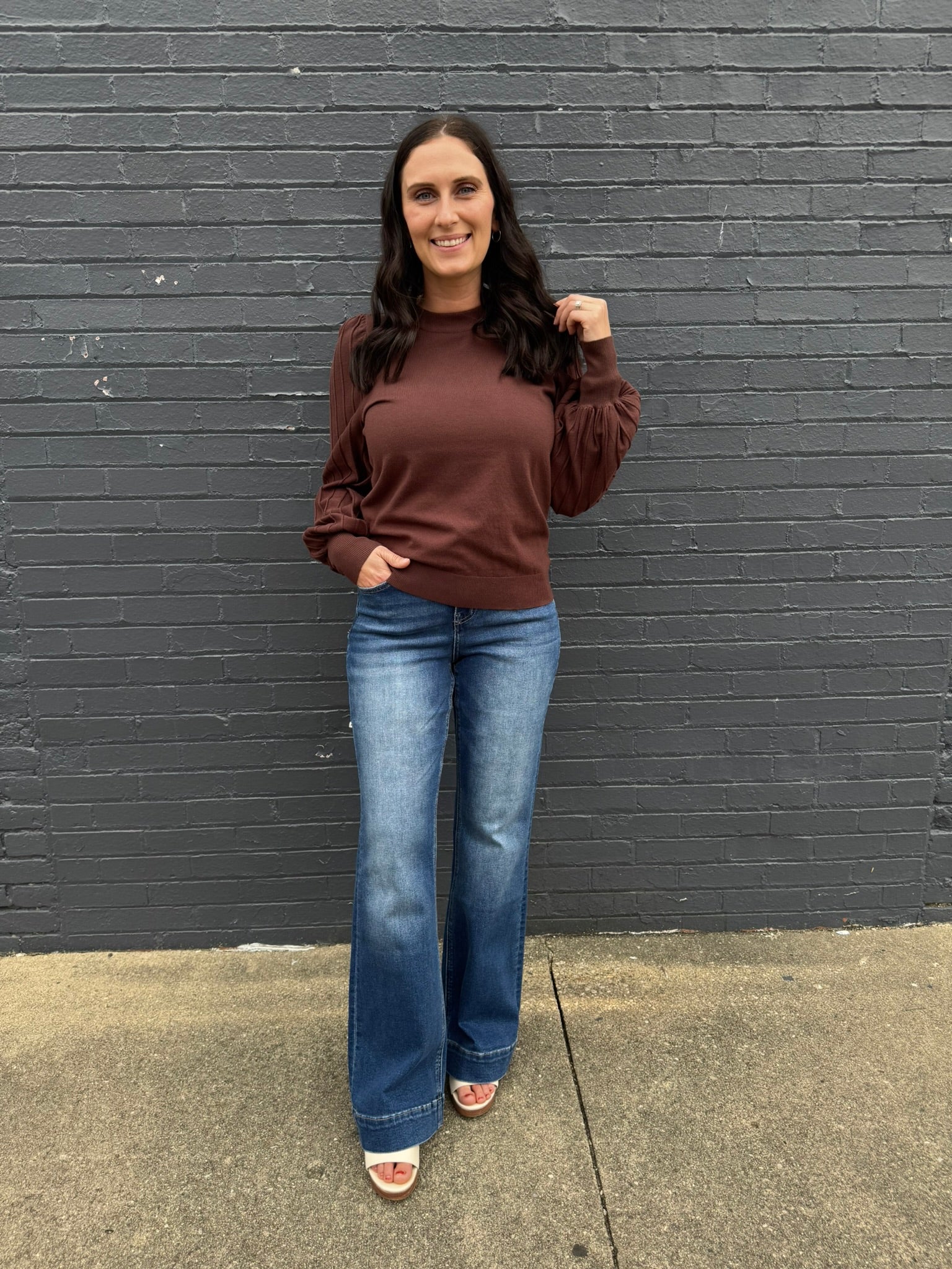 The Honey Brown Blouse is a classic pullover with a round neckline and a stylish stripe texture pattern. The drop shoulder sleeves and ribbed cuff and edges add a touch of elegance. Perfect for any occasion, this blouse is comfortable, stylish, and versatile. Upgrade your wardrobe today with this timeless piece.