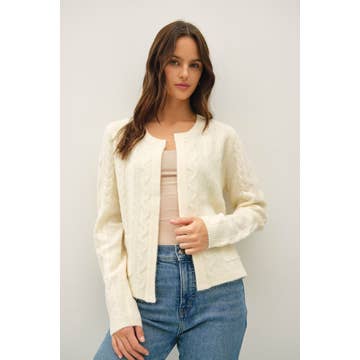 Wrap yourself in cozy elegance with the Marsha Ivory Cardigan. This wool blend open cardigan features a timeless cable knit design and long sleeves for layered warmth. Practical front patch pockets add everyday functionality to this versatile piece. Perfect for transitional seasons or layering year-round, it's a wardrobe essential that effortlessly elevates any outfit.
