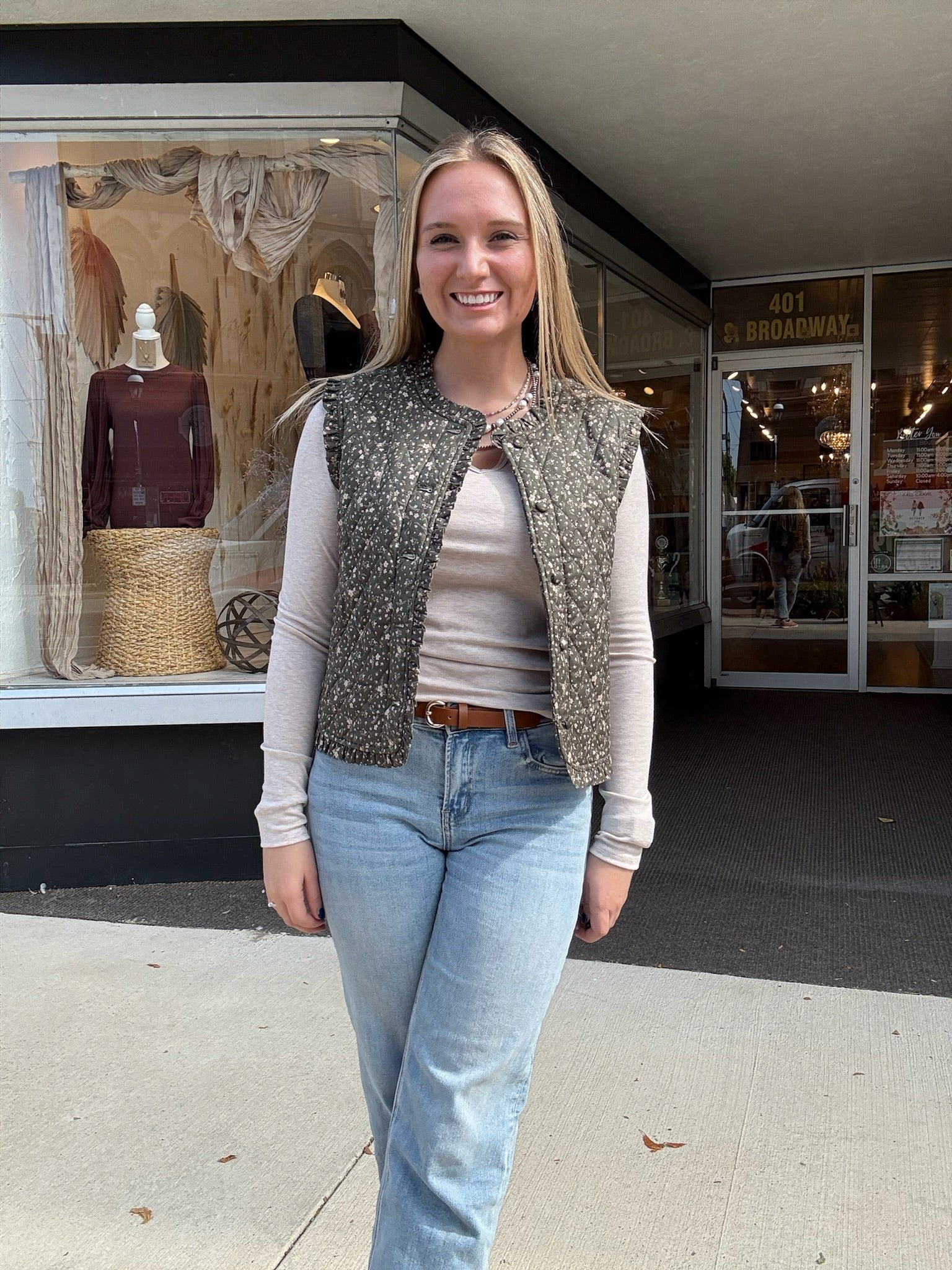 Embrace cozy style with the Quilted Fall Olive Vest, featuring charming ditsy print woven fabric and delicate ruffle detailing. Its button-down design ensures easy wear, while lightweight quilting provides warmth without bulk. Perfect for layering, this vest adds a feminine touch to any autumn outfit.