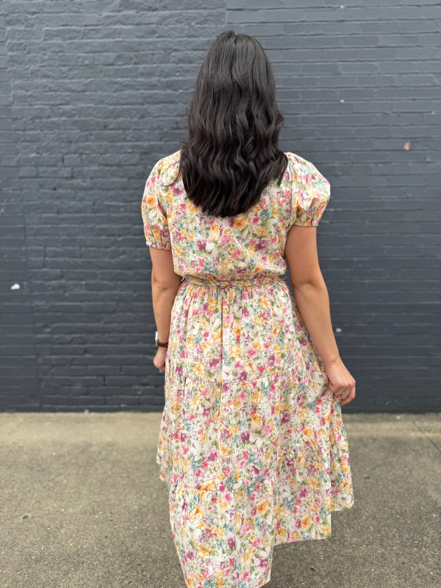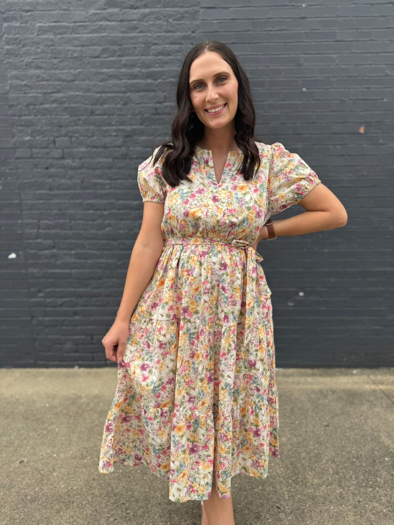 Step into sunshine with the International Love Dress, featuring a charming floral print that brightens any day. The belted waist adds a flirty touch, flattering your silhouette, while the tiered skirt brings playful movement with every step. Perfect for twirling through spring and summer adventures in style!
