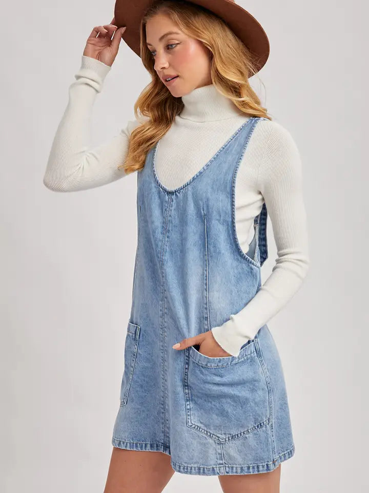 This denim washed overall-style dress features a deep scoop-neckline at the front, with wide shoulder straps. The dress has a distinct A-line silhouette, flaring out slightly from the waist to a mini-length hem that falls above the knees. Key details include two large, prominent patch pockets on the front of the skirt portion. There's also a visible vertical seam running down the center front of the dress. The denim has a classic, slightly faded look, suggesting a comfortable, worn-in feel. It's styled as a layering piece, worn over a long-sleeved top in the image.