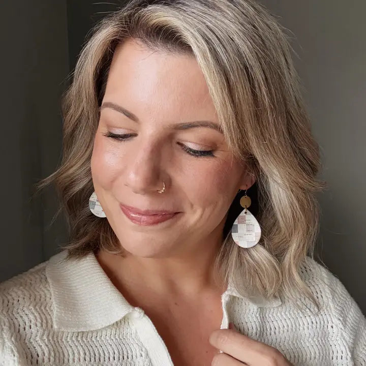 Made from cork backed with genuine leather, raw brass, and hypoallergenic gold plated brass ear wires. Designed, cut, and assembled in our home studio in Selah, Washington.