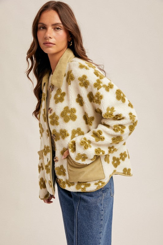Wrap yourself in cozy charm with this adorable color block teddy jacket featuring a delightful floral print. The soft, plush fabric feels like a warm hug, while the playful design brings instant personality to any outfit. Perfect for layering on chilly days or throwing on for effortless style, this jacket combines comfort with eye-catching flair. Whether you're running errands or relaxing at home, it's your new go-to piece for feeling both snug and fabulous.