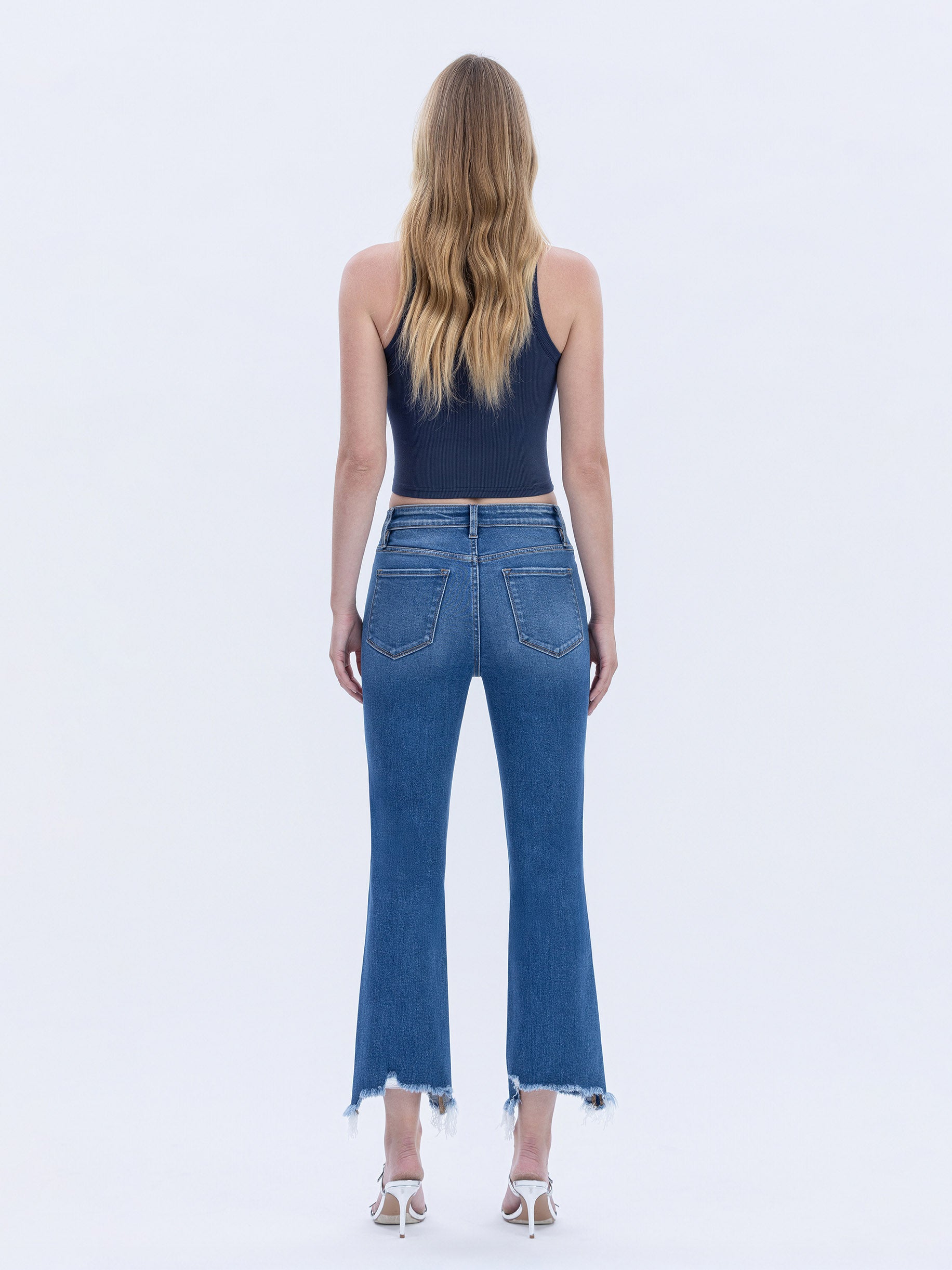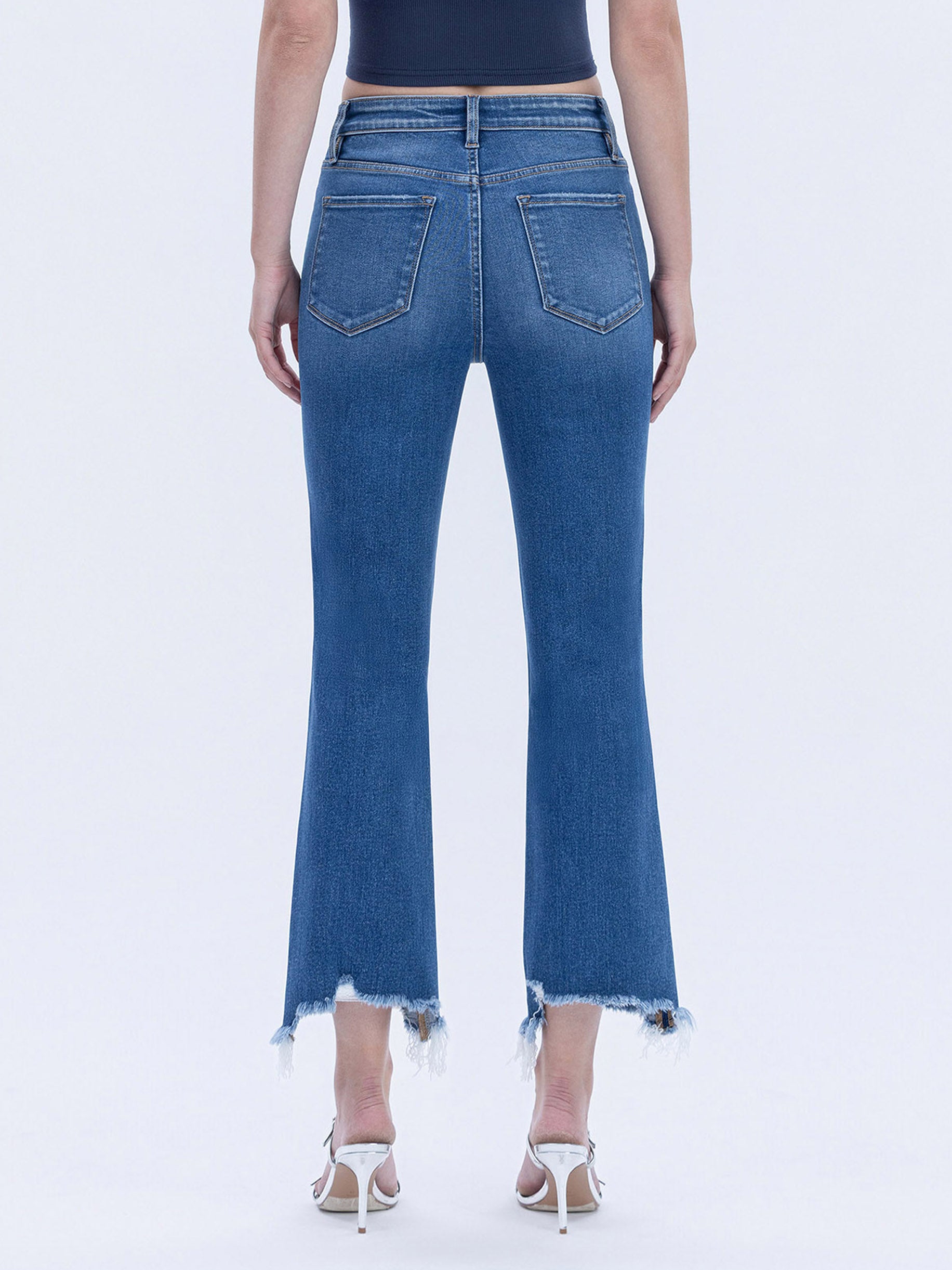 These Divine High Kick Flare jeans feature a comfortable stretch denim fabric and a flattering high-rise waist. The cropped length with a distressed hem adds a trendy touch, while the kick flare cut offers a stylish silhouette perfect for everyday wear.