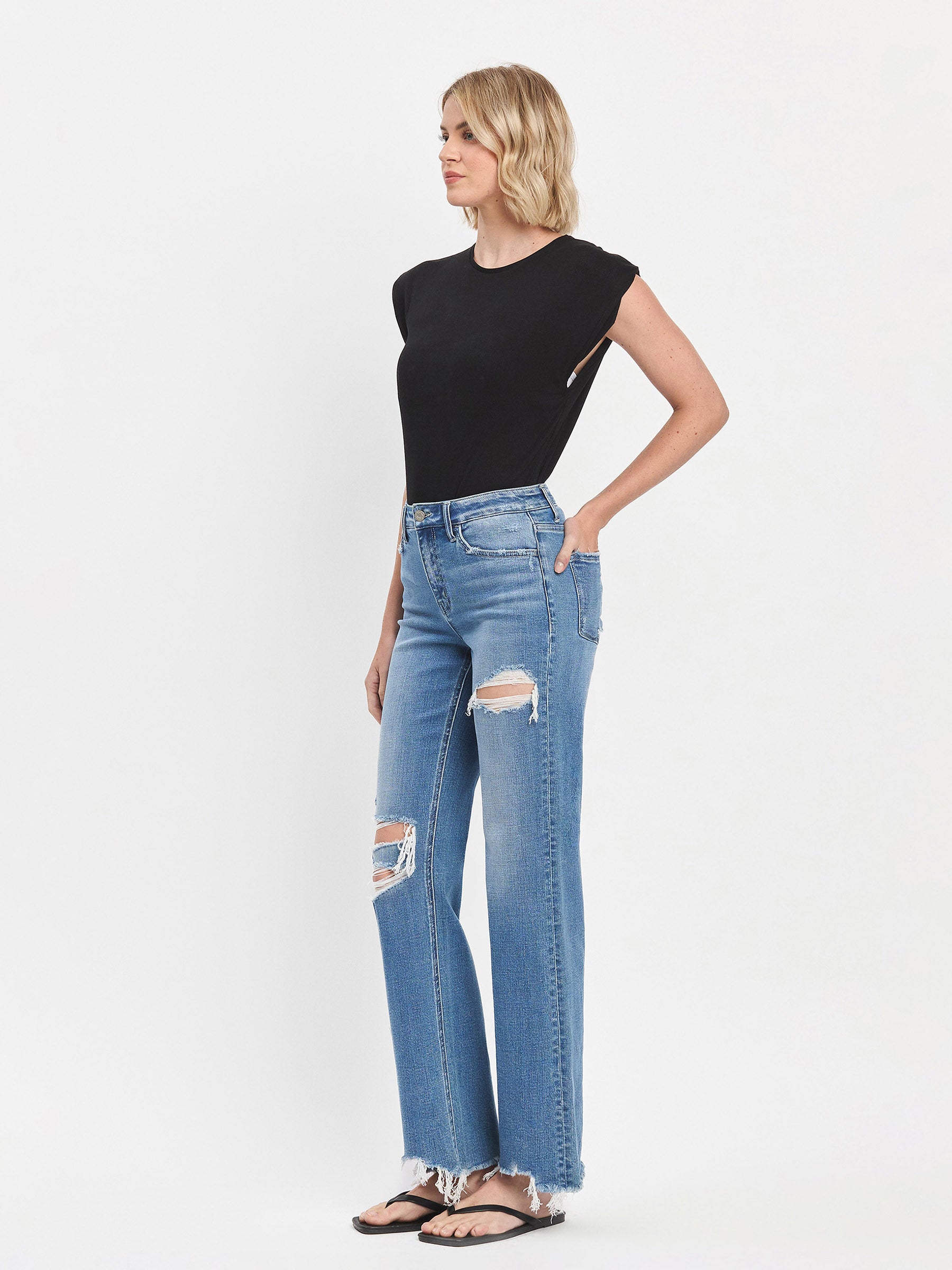 These Glancing High Slim Wide jeans offer a comfortable stretch fit with a flattering high-rise waist. Featuring five practical pockets and stylish distressed details, they bring a casual cool vibe. The uneven raw hem adds unique character, while the full-length cut in a medium ash shade completes the modern look. Perfect for effortless everyday style.