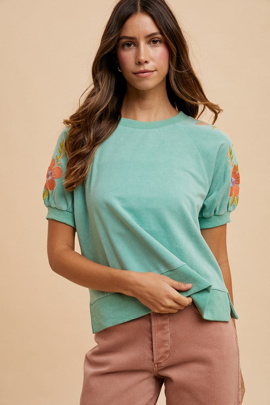 Add a splash of fun to your wardrobe with the Cilka top. Featuring a soft mineral wash for that perfectly worn-in feel, playful floral embroidery on the bubble sleeves, and a trendy side slit, it’s the cozy statement piece you didn’t know you needed. Perfect for days when comfort meets charm!