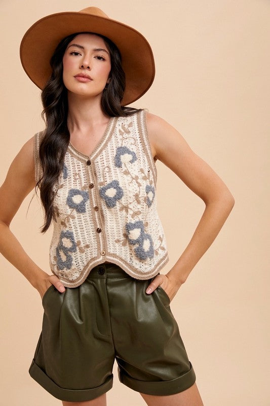 Add a touch of whimsy to your wardrobe with this playful crochet sweater vest, featuring charming floral embroidered patches and a classic button-down front. Perfect for layering, it brings cozy texture and a splash of floral fun to any outfit.