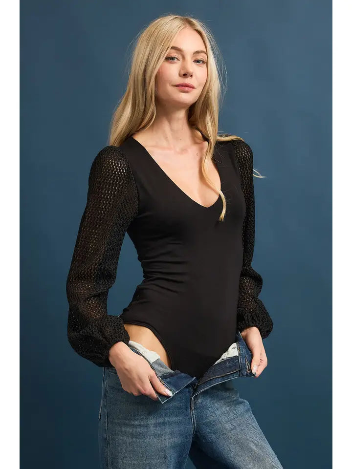 Elevate your style with the Bella Bodysuit in Black, featuring a double-layered v-neck that adds a flirty touch. The contrast lace balloon sleeves bring a playful, romantic vibe, making this piece perfect for turning heads day or night. Comfortable yet chic, it’s your new go-to for effortless glam.