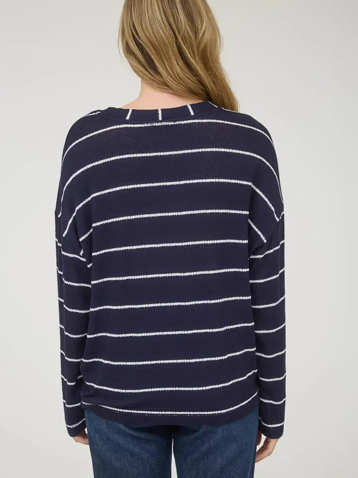 The Carissa Blue Stripes top features a comfortable round neckline and long sleeves, designed with a relaxed fit and drop shoulder for easy movement. Its timeless stripe pattern adds subtle style, making it a perfect choice for everyday wear that supports both comfort and confidence.