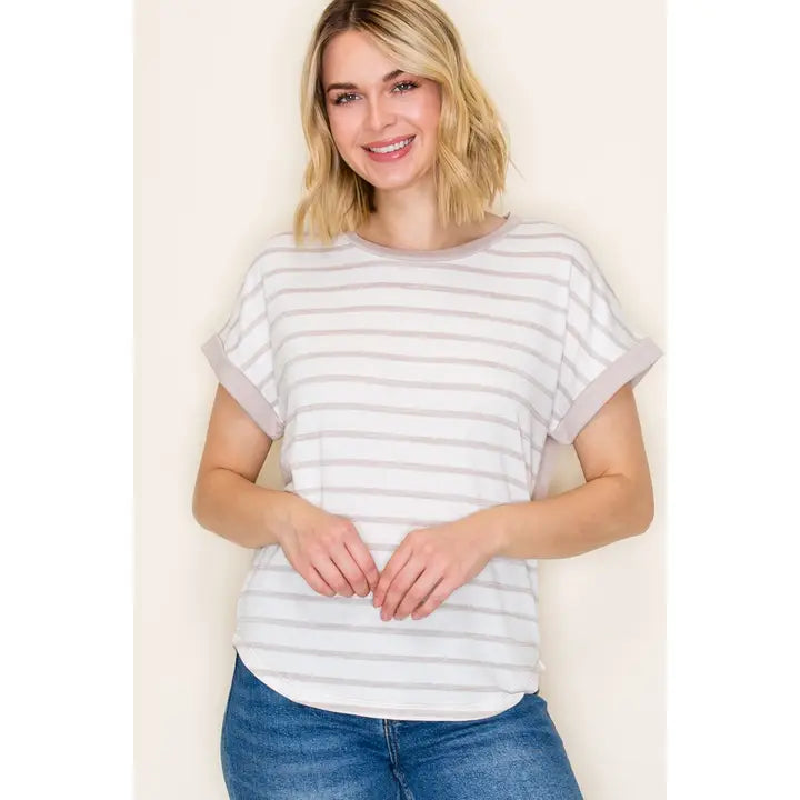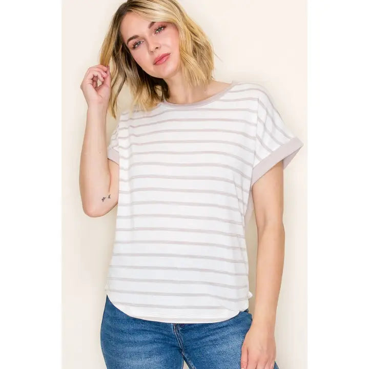 Crew neck, short sleeve, solid contrast back, striped top