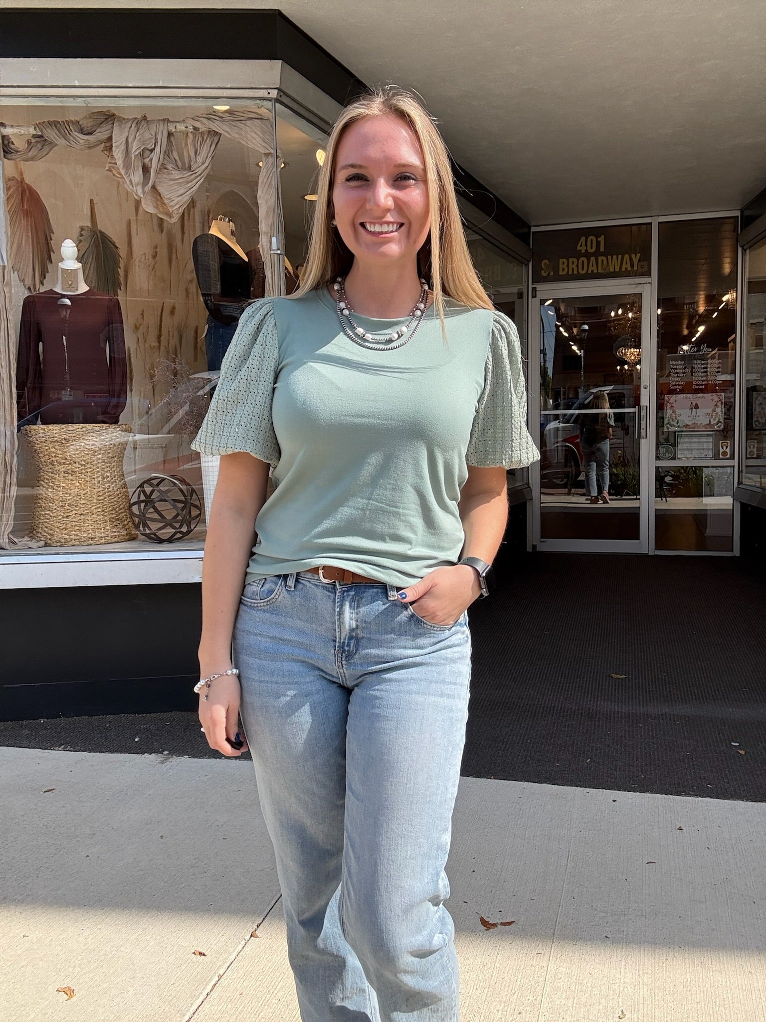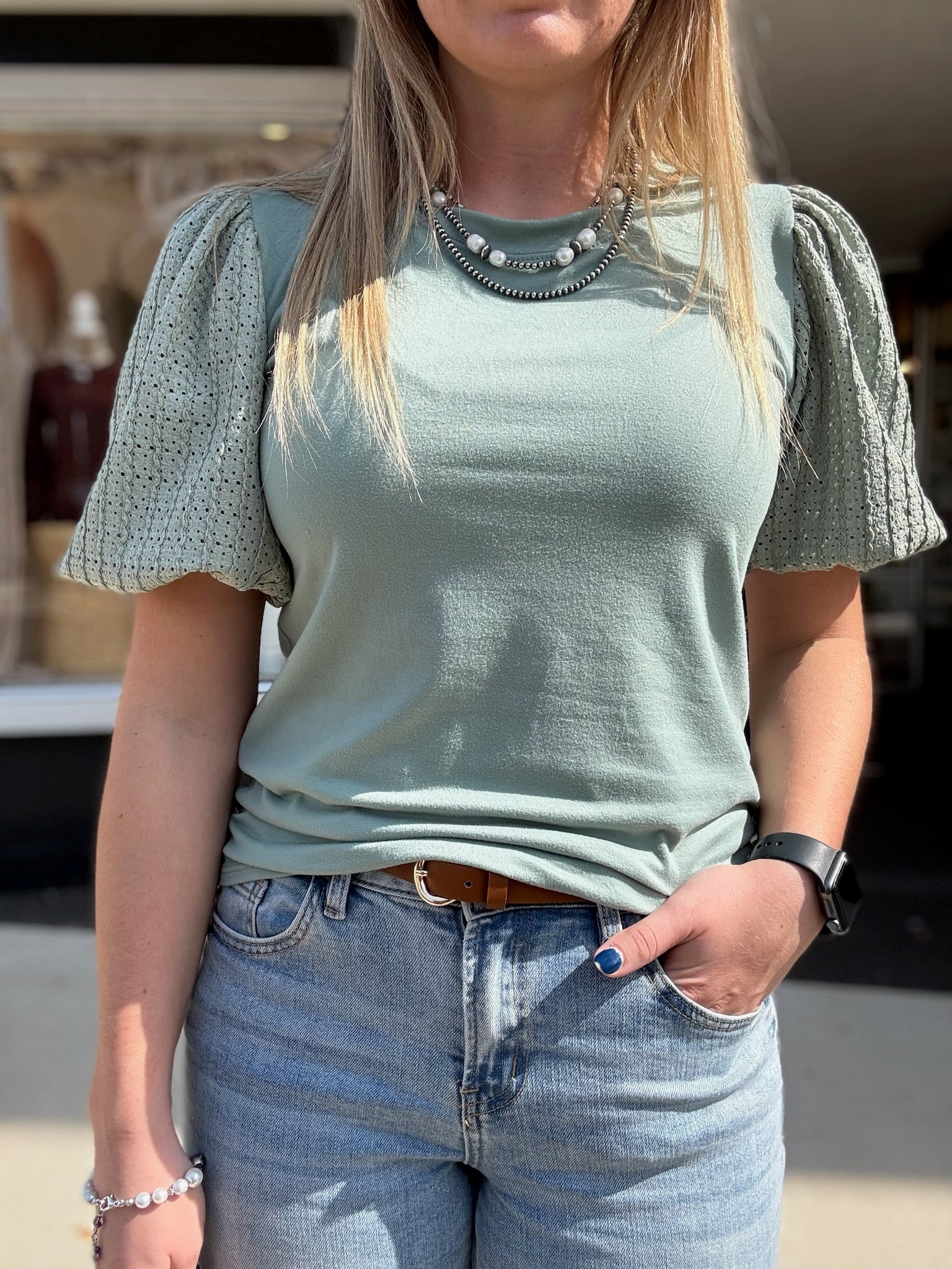 Elevate your wardrobe with the Laney Sea Green Top. This solid top features contrasting puffed sleeves that add a touch of femininity. With its versatile design, you can easily dress it up or down for any occasion. Look stylish and feel comfortable with this must-have piece.