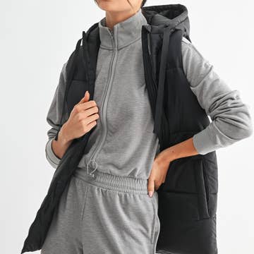 With a longline silhouette, our poly fill padded vest is an ideal throw on piece for when the temperatures start to drop. It features a full front zip with zipper facing, a three panel hood, a high neck, an adjustable drawcord at the hood, hand pockets, and an adjustable bungee at the hem to keep warmth in.