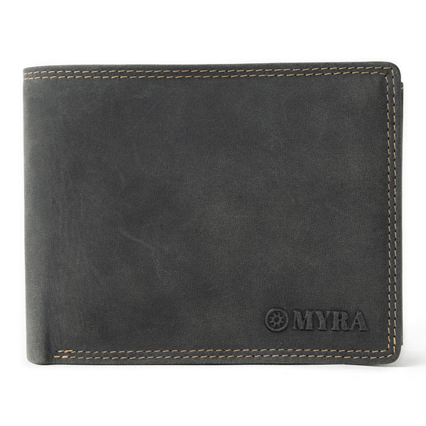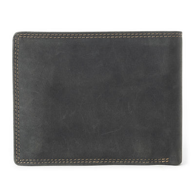 This men's wallet features a classic bifold design in rugged distressed brown leather. The wallet showcases distinctive double-row contrast stitching along the edges, adding both durability and visual interest. The minimalist exterior has a weathered finish that gives it a refined yet rustic appearance.
