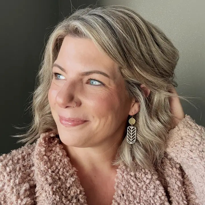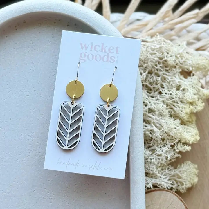 Made from hand painted Baltic Birch wood, raw brass, and hypoallergenic gold-plated brass ear wires. Designed, cut, and assembled in our home studio in Selah, Washington.