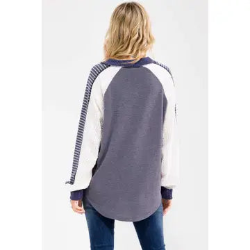 Effortless style meets thoughtful details in this relaxed knit pullover. The soft, solid fabric is elevated with delicate crochet lace and striped contrast on the sleeves, while a flattering v-neckline and curved hem create a polished silhouette. Long sleeves and exposed stitching add texture and visual interest. Perfect for layering or wearing solo, this piece transitions seamlessly from casual days to weekend outings.